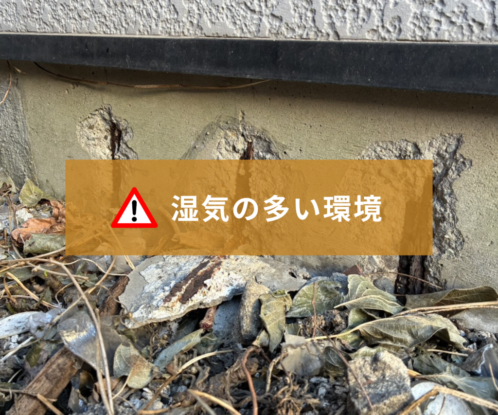 湿気が多い場所ではカビの発生や鉄筋の腐食が進み、爆裂現象や基礎の耐力低下を引き起こすため注意が必要です。