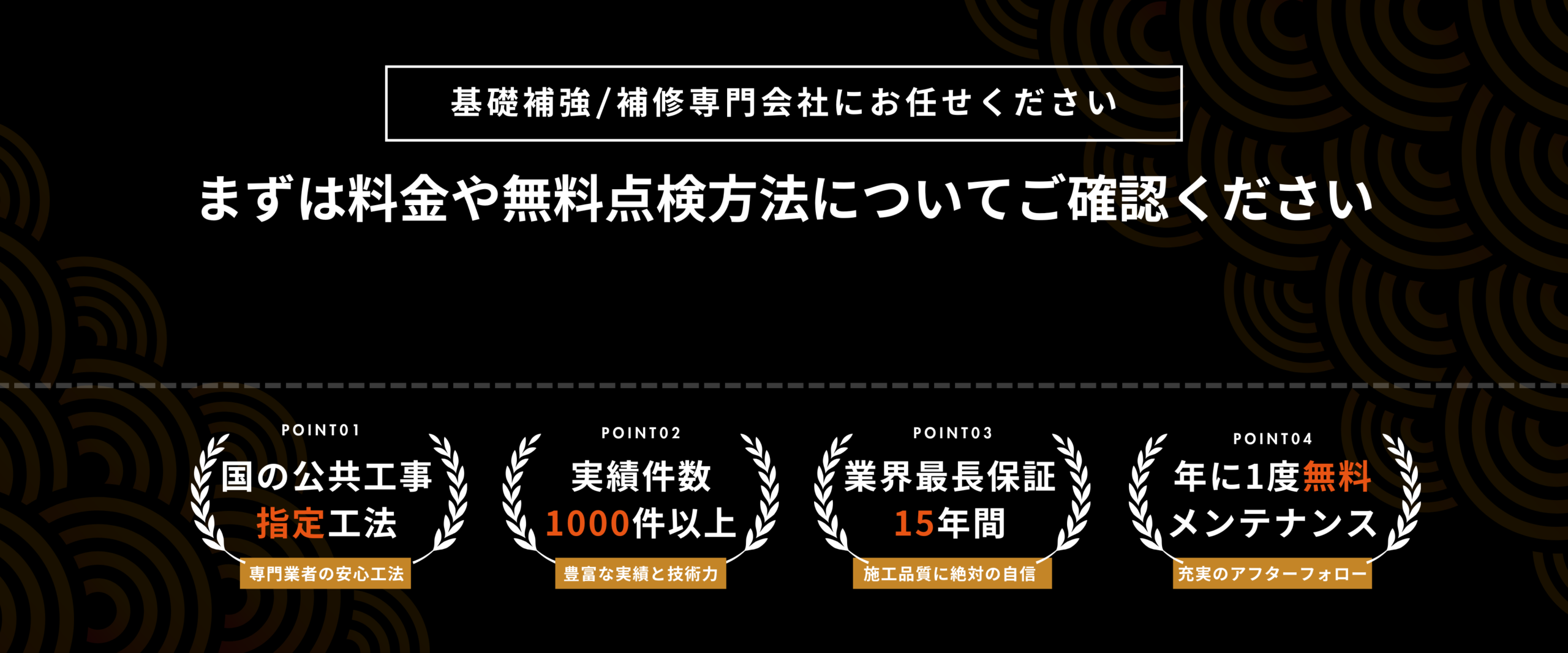 キソシンでは、神奈川県横浜市を中心に「基礎補強・基礎補修」を専門に行っています。基礎のひび割れや劣化は、建物の傾きや耐震性の低下につながる重要な問題です。当社では、床下専門の職人が細部まで丁寧に点検し、状況に合わせた最適な工法をご提案。補修による劣化の改善から、強度を高める補強工事まで幅広く対応しています。住まいの安全と寿命を守るために、確かな技術と経験で安心の施工をお届けします。